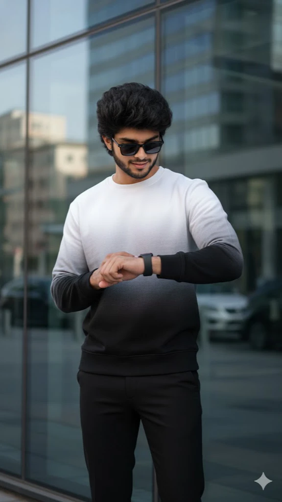 “A hyper-realistic cinematic 9:16 portrait based on the uploaded image, keeping the same face and hairstyle of A confident young man standing against a sleek modern building wall with large reflective glass panels. He wears a gradient sweatshirt transitioning from pure white at the top to deep black at the bottom, paired with fitted black pants. His accessories include dark sunglasses and a smartwatch on his left wrist. He is gazing at his watch with a poised, composed expression. His voluminous hairstyle is styled upward with precision. The urban background features subtle reflections of city buildings and street elements in the glass, adding depth and realism. Lighting is soft natural daylight with gentle shadows and highlights on the face and clothing. The overall mood is stylish, contemporary, and self-assured. Rendered in ultra-realistic 8K HD with crisp textures, lifelike skin tones, cinematic depth of field, and high dynamic range.”