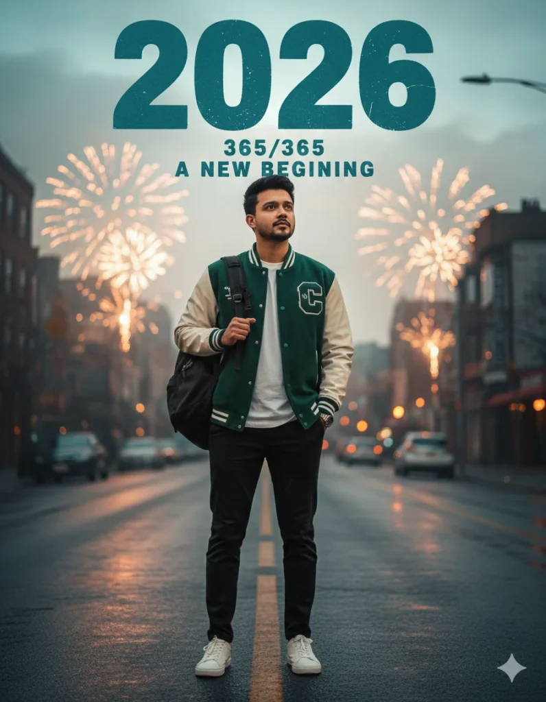 A cinematic portrait of a stylish man, standing one hand in his pocket and the other holding the strap of his backpack, looking slightly upward as if embracing new possibilities. Wears varsity jacket, white Tee, tapered black joggers, and clean white sneakers. Above him, large stylized text reads: “2026” in a bold, slightly distressed teal font, with smaller text below: “365/365” and “A NEW BEGINNING”. Cinematic photography style, highly detailed, soft lighting, dreamy atmosphere,New Year theme