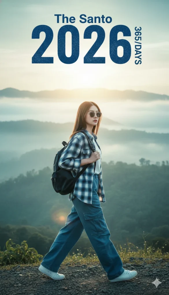 “Create a cinematic vertical poster-style image of a young woman walking outdoors in a natural landscape. She is wearing a white t-shirt, a checkered blue-and-white flannel shirt over it, blue cargo-style pants, and carrying a black backpack. She has straight, medium-length hair and is wearing sunglasses. Capture her in a full-body side profile pose while walking forward. The background should be a soft, misty early-morning scene with blurred hills, fog, and greenery, creating a calm and peaceful atmosphere. The lighting should be warm and natural, giving a sunrise feel. At the top of the image, add bold large typography: ‘2026’ in a textured, grunge-style blue font. Above it, place a small title text: ‘The Santo’. To the right side of the large numbers, add the text ‘365/DAYS’. The overall mood should feel motivational, adventurous, and aesthetic — like a movie poster or inspirational travel poster. Use shallow depth of field, high resolution, and soft tones.”