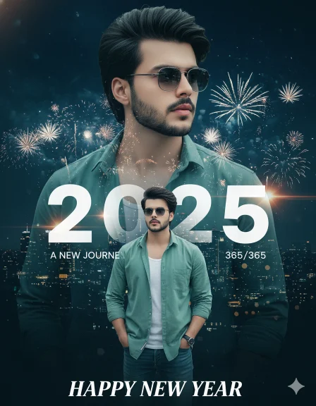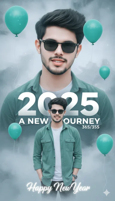 A stylish, cinematic New Year’s greeting photo manipulation. A young, cool-looking man with trendy hair (mullet-style) and sunglasses, wearing a teal/dusty green open button-down shirt. The composition is double-exposure style: a large, dominant portrait of the man in the background, with a smaller, full-body version of him layered in the foreground. Dominant text in a modern, bold font reads “2025” fading into “2026” with the subtitle “A NEW JOURNEY” and “365/365”. At the bottom, stylized,