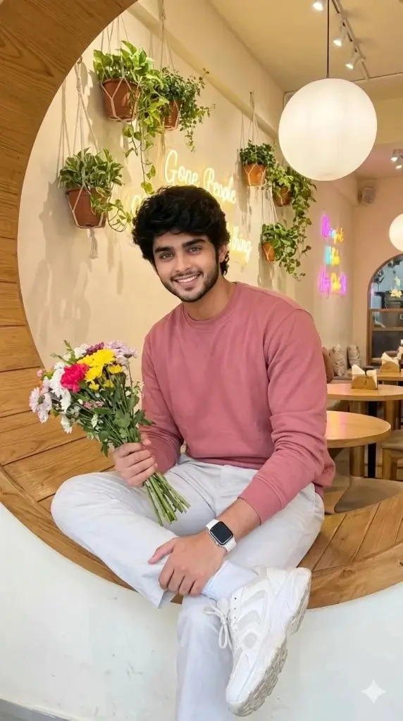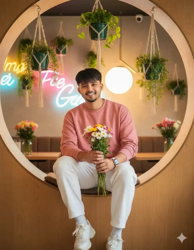 “A vibrant indoor lifestyle photo of a young man sitting in a circular wooden nook On wall with hanging plants and neon lights with big white ball,, wearing a colorful pink rose colour fullSleeve sweetshirt, light white trousers, White Apple Watch, Wight socks, and chunky white sports shoes, Full Body View casual relaxed pose looking down, One Hand holding a flower bookey, bright soft lighting, cozy modern cafe vibe” with flowers in background eyes on camera. Keep my face 100% uploaded photo
