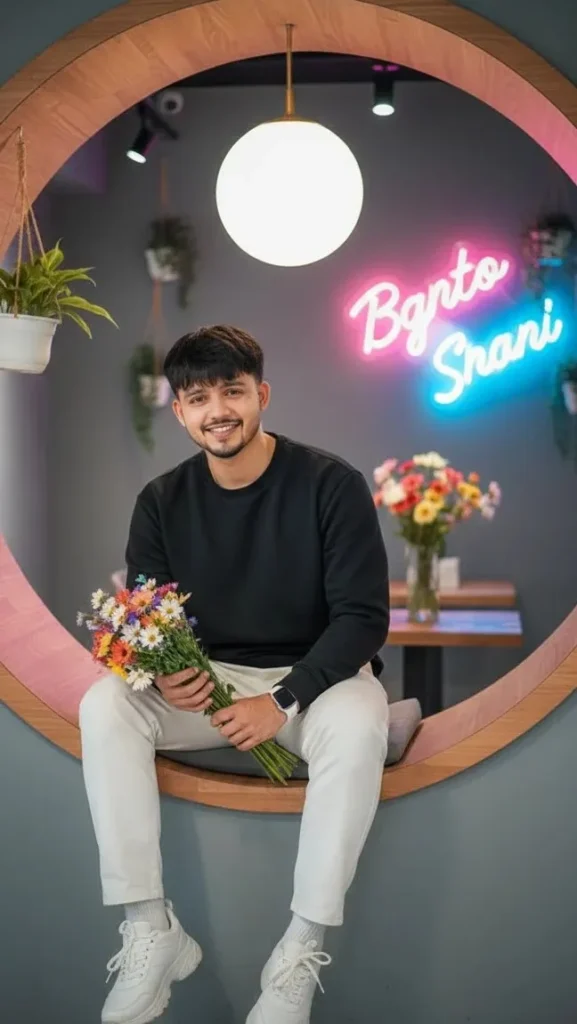 “A vibrant indoor lifestyle photo of a young man sitting in a circular wooden nook On wall with hanging plants and neon lights with big white ball,, wearing a colorful black colour fullSleeve sweetshirt, light white trousers, White Apple Watch, Wight socks, and chunky white sports shoes Full Body View casual relaxed pose looking down, One Hand holding a flower bookey, bright soft lighting, cozy modern cafe vibe” with flowers in background eyes on camera. Keep my face 100% uploaded photo