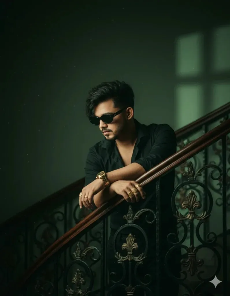 Create a 8k ultra hyper-realistic dark green portrait cinematic image with dramatic confident actions. (uploaded photo 100% face match)of a 5.10feet young man (same face and hair as reference), messy hair falling over one eye, looking down-left. Wearing a black shirt and black goggles, standing casually on a spiral staircase with left forearm on ornate metal railing, gold rings and a gold watch visible