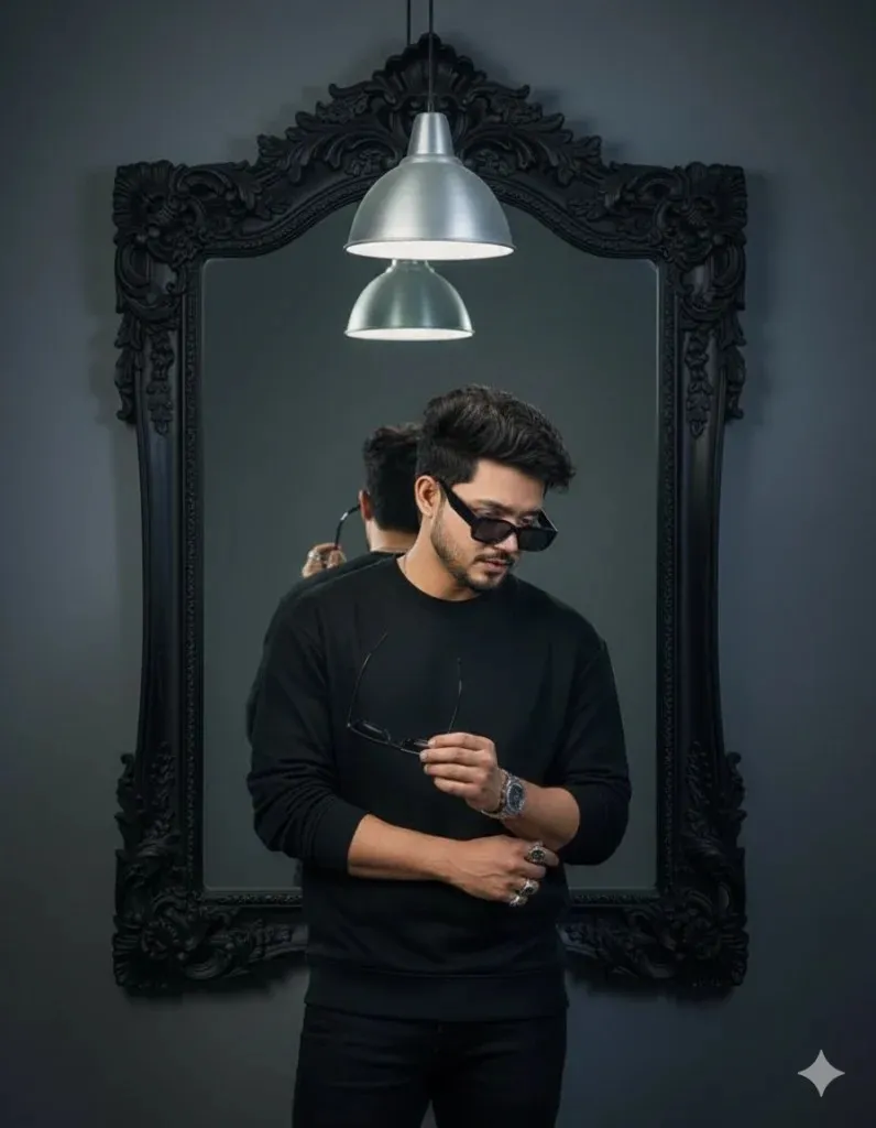 Ultra-realistic cinematic portrait of a stylish young man in a black sweatshirt, silver rings, luxury wristwatch, and sunglasses, standing in front of an ornate black baroque mirror. The man poses with arms crossed near his waist, looking down confidently. In the mirror reflection, he holds sunglasses mid-action, creating a surreal dual pose. Voluminous tousled hair, sharp beard, moody diffused lighting, minimal gray background, modern silver lamp above. High-fashion editorial, ultra-detailed