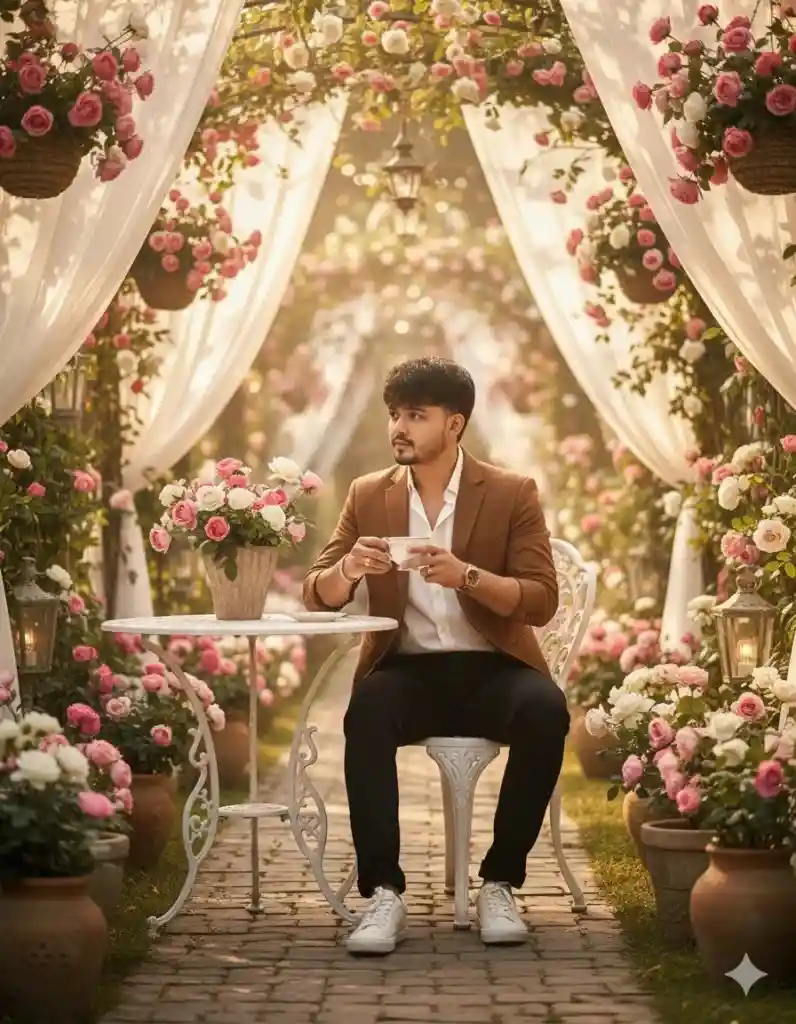 A hyper-realistic cinematic 9:16 portrait based on the uploaded image, keeping the same face and hairstyle of A young person sitting gracefully at a white wrought-iron garden table, holding a delicate white teacup with both hands, surrounded by a lush, romantic garden. The garden is filled with blooming pink and white roses in ceramic pots and hanging baskets, arranged symmetrically for visual harmony. White sheer drapes flow gently from a pergola-like structure overhead, creating a soft, dreamy ambiance. The person wears a stylish brown jacket layered over a crisp white shirt, paired with fitted black trousers and clean white sneakers. Their posture is relaxed yet elegant, gazing thoughtfully into the distance. The lighting is soft morning sunlight filtering through the foliage, casting gentle shadows and warm highlights. Background features include a cobblestone path, vintage lanterns, and subtle bokeh effects from distant flowers. The overall mood is serene, romantic, and cinematic. Rendered in ultra-realiastic