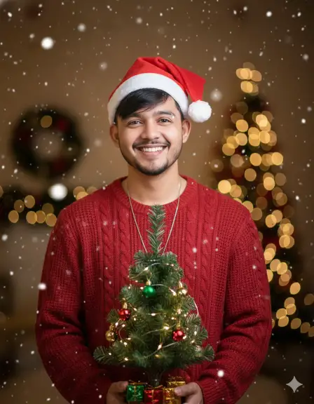 A festive Christmas portrait of a young man standing indoors, wearing a red Santa hat and a cozy red knitted sweater. He is smiling warmly while holding a small decorated Christmas tree with tiny ornaments, gift boxes, and warm fairy lights. Soft snowflakes fall gently around him, adding a magical winter feel. The background is softly blurred with golden Christmas lights and bokeh effects, creating a warm, glowing holiday atmosphere.”