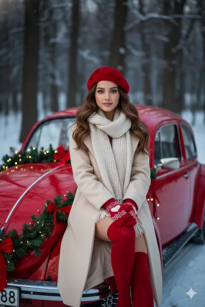“Create an 8K Christmas portrait of me with long, wavy brown hair, looking confidently at the camera. I am wearing a festive red beret, a thick cream-colored knitted scarf, a matching long cozy coat, and red knit gloves with white heart patterns on the palms. Additionally, I have on red over-the-knee socks. I am seated on the hood of a classic red Volkswagen Beetle decorated with Christmas garlands and small lights. The background should feature a softly blurred snowy forest with dark trees, evoking the atmosphere of a winter afternoon or twilight. The lighting should be soft and festive, highlighting both me and the car. The face remains exactly the same as in the provided reference photo, with no alterations.”