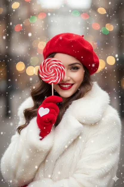“Create a portrait of me wearing a red beret and a fluffy white coat, holding a large red-and-white spiral lollipop that partially covers one eye. I have striking red lipstick and a sweet smile. My red glove has a clearly visible white heart. The background should depict a winter scene with a bokeh effect, falling snow, and blurred festive lights, creating a cozy and cheerful atmosphere. The face remains exactly the same as in the provided reference photo, with no alterations.”