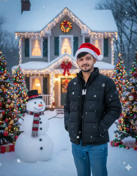 Ultra-realistic Christmas portrait using the real face from the uploaded photo (no face changes); a stylish boy wearing a red Santa cap, winter jacket and jeans; standing outdoors in light snowfall; a snowman nearby, colorful Christmas trees on both sides, and a snowy decorated house in the background; soft smile looking at camera; cinematic DSLR quality, fully realistic Christmas celebration mood.