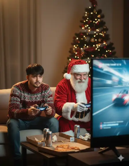 Ultra-realistic cinematic indoor night scene. On the LEFT, a man inspired by the uploaded reference photo sits on a couch wearing a cozy but stylish Christmas sweater, holding a PlayStation controller, focused expression. On the RIGHT, The old man Santa is sitting next to him, leaning forward aggressively with a controller, competitive grin on his face. A large TV in front shows a blurred football or racing game. Christmas tree lights softly illuminate the room, pizza boxes and energy drinks on the table. Warm ambient lighting mixed with neon TV glow, realistic skin and fur textures, cinematic depth of field, premium lifestyle realism, 8K quality.