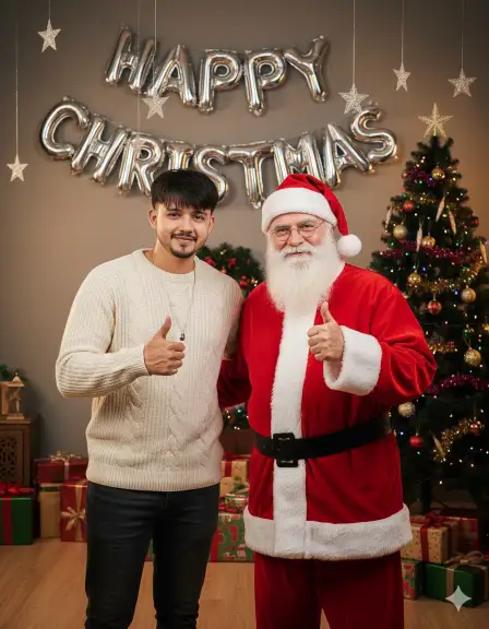 A hyper-realistic full-body portrait featuring the uploaded young man standing next to a Santa Claus, using the uploaded photo as the exact reference for the young man’s face, identity, skin tone, facial structure, hairstyle, age, and facial expression. Keep his exact natural expression. Both the young man and Santa Claus are standing naturally, both showing thumbs up. They are positioned in front of a festive scene with “Happy Christmas” balloons, a decorated Christmas tree nearby, Christmas gifts on the floor, and subtle hanging star decorations. Soft cinematic lighting with warm holiday tones, cozy festive atmosphere. Ultra-sharp focus, realistic skin texture and clothing details, professional photography quality, shallow depth of field, 4K hyper-realistic full-body portrait.