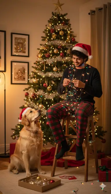 Ultra-realistic cinematic Christmas interior scene inspired by the reference image. A clean-shaven man with the exact facial features, face shape, skin tone, and proportions of the uploaded photo is sitting casually on a small wooden ladder while decorating a Christmas tree. He is wearing cozy Christmas-themed pajamas: red and green plaid pants, a dark sweater, and a playful Santa hat slightly tilted on his head. His hair and face remain clearly visible, natural and realistic. He is holding a string of colorful Christmas lights in his hands, looking at them with a slightly amused and focused expression. The lights are partially tangled around him and the ladder, creating a fun, candid moment. A fully decorated Christmas tree stands beside him, filled with ornaments, garlands, and warm glowing lights. At the bottom, a friendly dog wearing a small Santa hat looks up toward him, adding warmth and humor to the scene The environment is a cozy living room with framed artwork on the wall, warm ambient lighting, and a nostalgic holiday atmosphere. Soft shadows, realistic indoor light balance, natural skin texture (no oily look, no plastic skin), shallow depth of field, cinematic color grading, high-end lifestyle photography style, ultra-detailed realism, Nano Banana quality, 8K detail, no text, no logos, no watermarks.