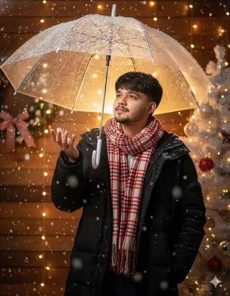 [Upload your reference portrait photo, then use this prompt:] Use the person from the uploaded reference photo as the main character. Clone their face and identity with 100% accuracy. Maintain the same age, gender, ethnicity, and facial structure. Do not stylize, alter, or reinterpret the face. Create a vertical hyperrealistic winter-night portrait featuring the person from the reference photo. They are standing under a transparent umbrella covered with snow, looking slightly upward with a soft and natural expression. They wear a black winter coat and a red-white checkered scarf, with one hand gently extended to catch falling snowflakes. Environment: Warm string lights in the background, wooden wall textures, and a decorated white Christmas tree with ribbon ornaments. Heavy snowfall illuminated by a strong warm backlight shining through the umbrella, creating a dreamy cinematic atmosphere with visible snow particles. Lighting: Warm backlight plus soft ambient fill. High-contrast snow particles. Soft, glowing, romantic winter mood. Camera: Medium shot, slightly low angle, shallow depth of field, strong bokeh lights, cinematic framing. Style: Hyperrealistic, ultra-detailed, 4K quality. Clean, elegant, and atmospheric. Prioritize accurate face matching to the reference photo over everything else. No text, no watermark..