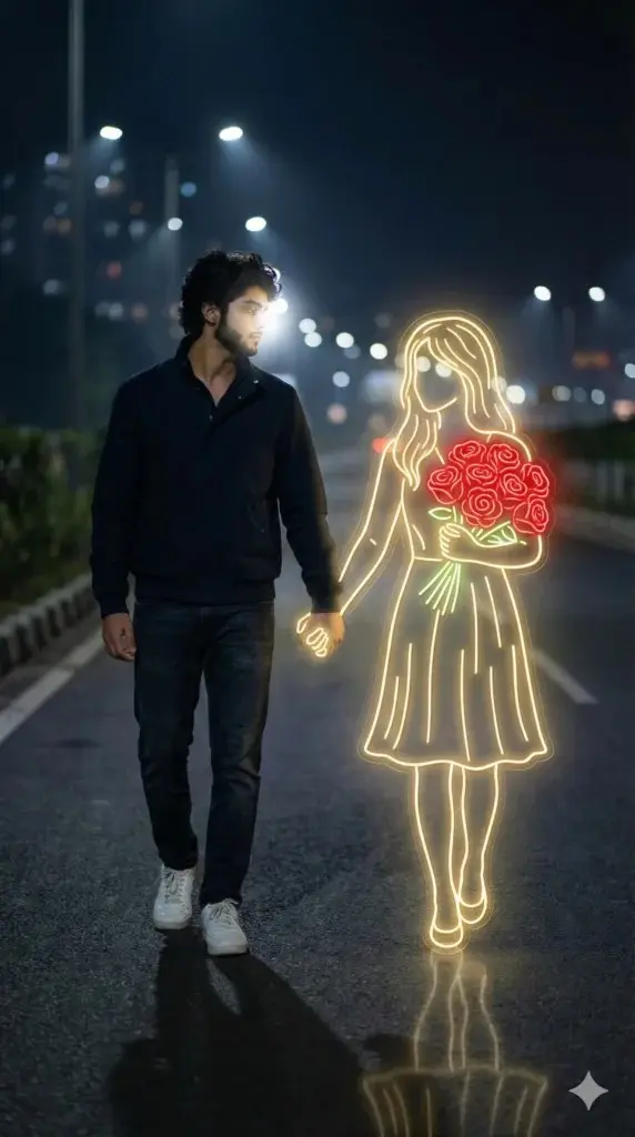 young man walks alone on a dimly lit path at night, wearing dark casual clothes and white sneakers. Beside him appears a Golden glowing, neon-style illustration of a girl holding a bouquet of bright red roses. The neon girl emits a soft white light, contrasting against the dark, blurry background of city lights in the distance. The atmosphere feels calm, melancholic, and slightly surreal, blending reality and imagination. 100% accurate my face, both holding hand middle of road
