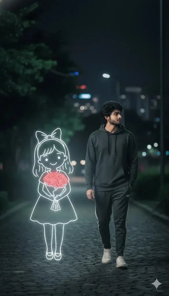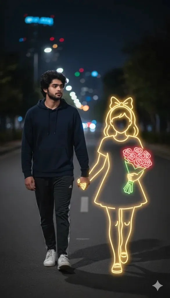 young man walks alone on a dimly lit path at night, wearing dark casual clothes and white sneakers. Beside him appears a Golden glowing, Deon-style illustration of a girl holding a bouquet of bright red roses. The neon girl emits a soft white light, contrasting against the dark, blurry background of city lights in the distance. The atmosphere feels calm, melancholic, and slightly surreal, blending reality and imagination. 100% accurate my face, both holding hand middle of road