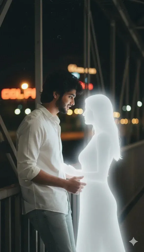 Retro cinematic photograph of a young man (uploaded image) standing on a bridge at night, facing and softly talking to showcasing a stark contrast between presence and absence. The girl has a delicate feminine silhouette made of soft white light with smooth edges, appearing like a memory or dream. Both stand close, slightly leaning toward each other in conversation. The camera captures a medium side shot showing their profiles from the waist up, with blurred city lights behind them. The image should have a nostalgic retro film look-slightly faded colors, soft focus, mild grain, and natural lighting. The glow from the girl should illuminate the man’s face subtly, with realistic shadows and highlights. The overall tone should be calm, emotional, and cinematic, resembling an old film still rather than a digital render. Add film texture, lens softness, and analog photo imperfections for authenticity.”. “upload_image”: “your_image_hora”, “style”: “retro cinematic realism, soft emotional