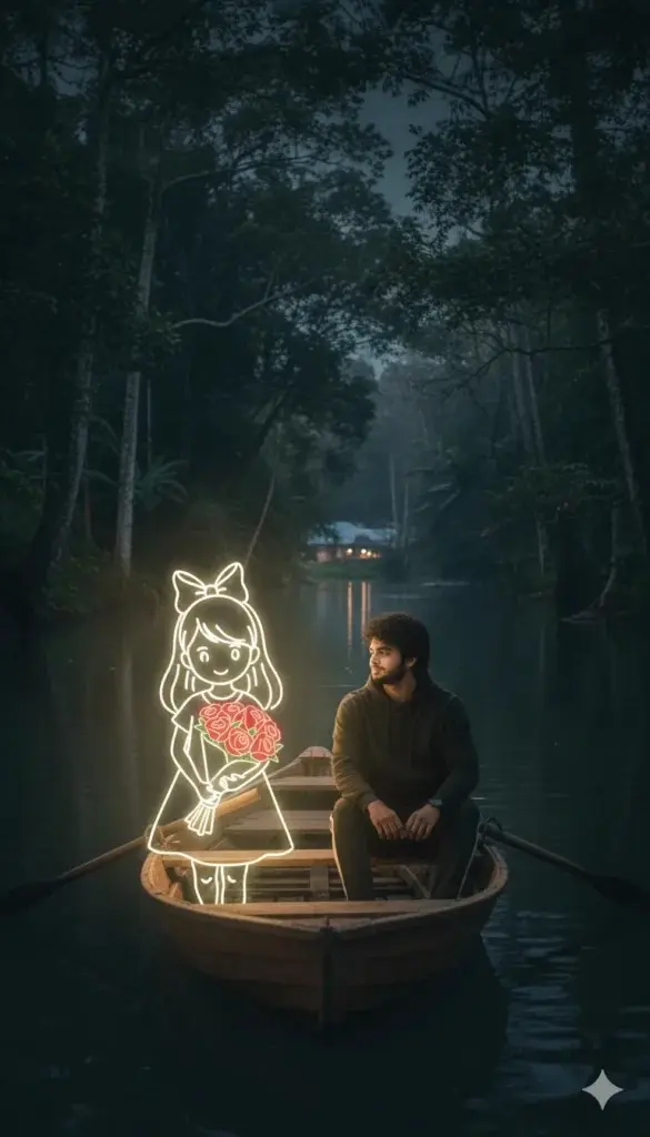 young me walks alone on a dimly lit path at night, wearing dark casual clothes and white sneakers. Beside him appears a Golden glowing, neon-style illustration The neon girl emits a soft white light, contrasting against the dark, blurry background of city lights in the distance. The atmosphere feels calm, melancholic, and slightly surreal, blending reality and imagination. 100% accurate my face, girl and me sit in a boat middle of river, jungle around us