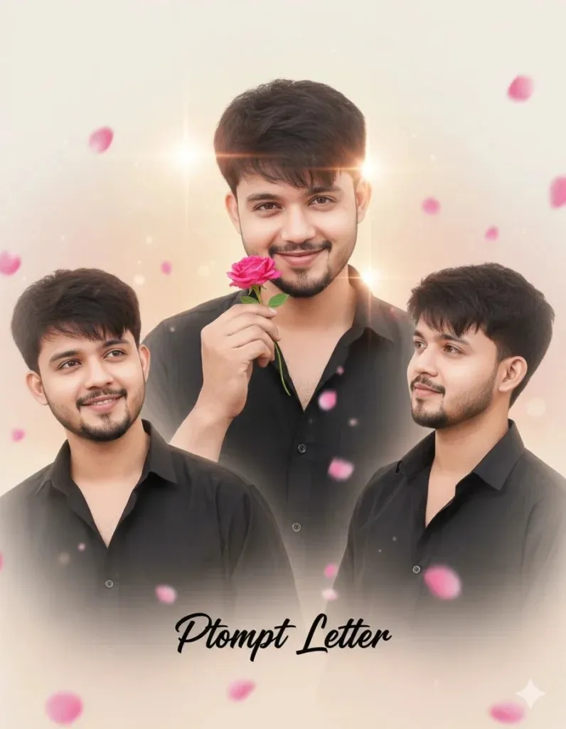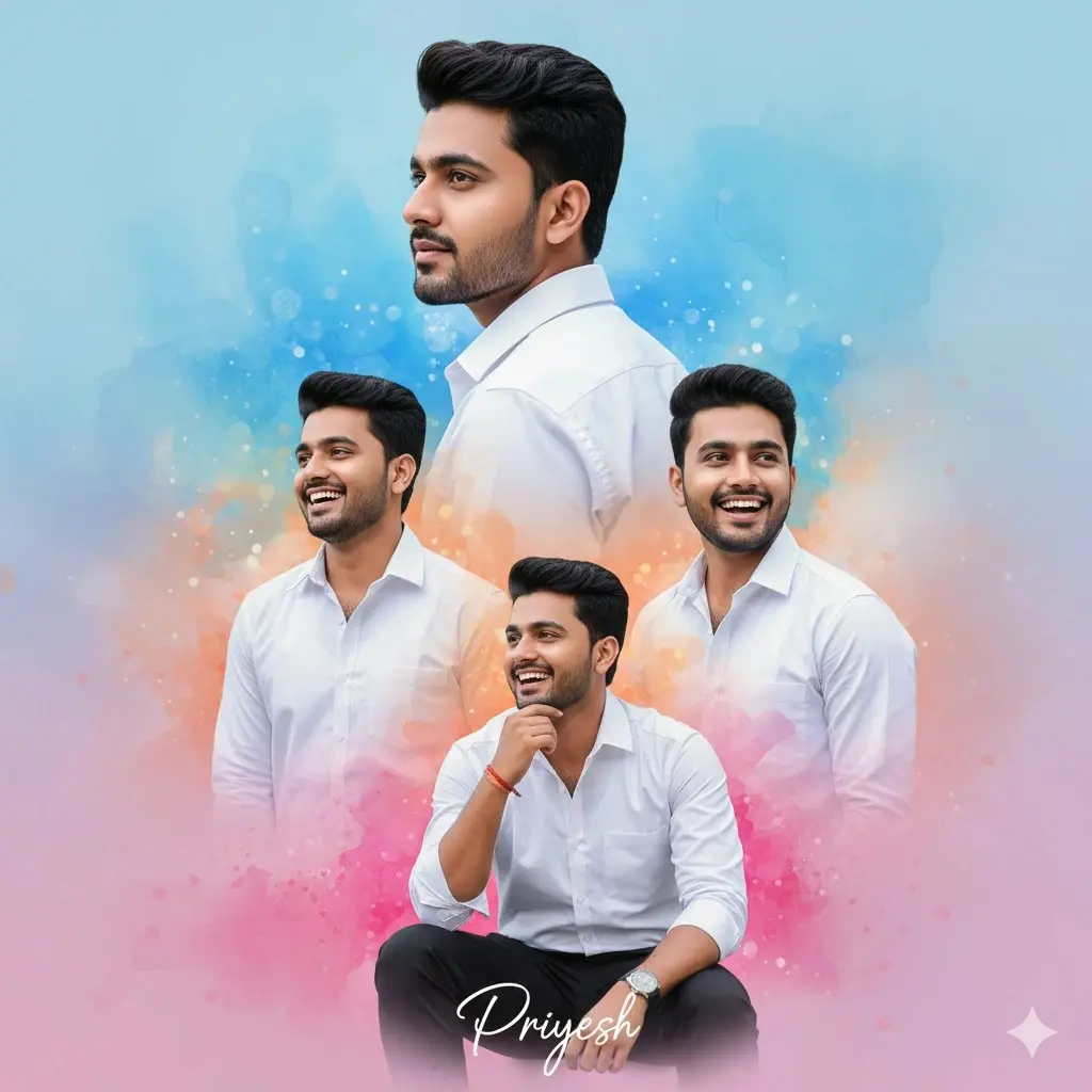 Create a vibrant, cinematic birthday-style collage portrait of a handsome young man instead of the woman. Keep the exact same layout, background, and artistic style as the referencien soft watercolor background blending blue, pisloforange and white tones, glowing dreamy effects, festi Indian celebration be. Include multiple poses of the same male: A large side profile at the top, looking backwards over the shoulder with a calm confident expression (same angle as original top portrait). Two mid-size smiling portraits in the center, natural laughter and traditional celebration mood. One sitting pose at the bottom, restin joyful manner – same position as nd on chin in a thoughtful, e original bottom boy. Outfit: crisp white full-sleeve shirt, black formal trousers, well-groomed hair, subtle traditional accessories like a wristwatch (no heavy jewelry). Natural skin tone, soft shadows, clean facial features. Background remains festive and artistic – watercolor color splash blending orange, blue, pink smoke-style effects. Traditional Indian celebration essence but adapted for a male look. Text at the bottom in stylish handwritten font should display only “Prompt Letter” (no birthday text). High-resolution, ssy pester style