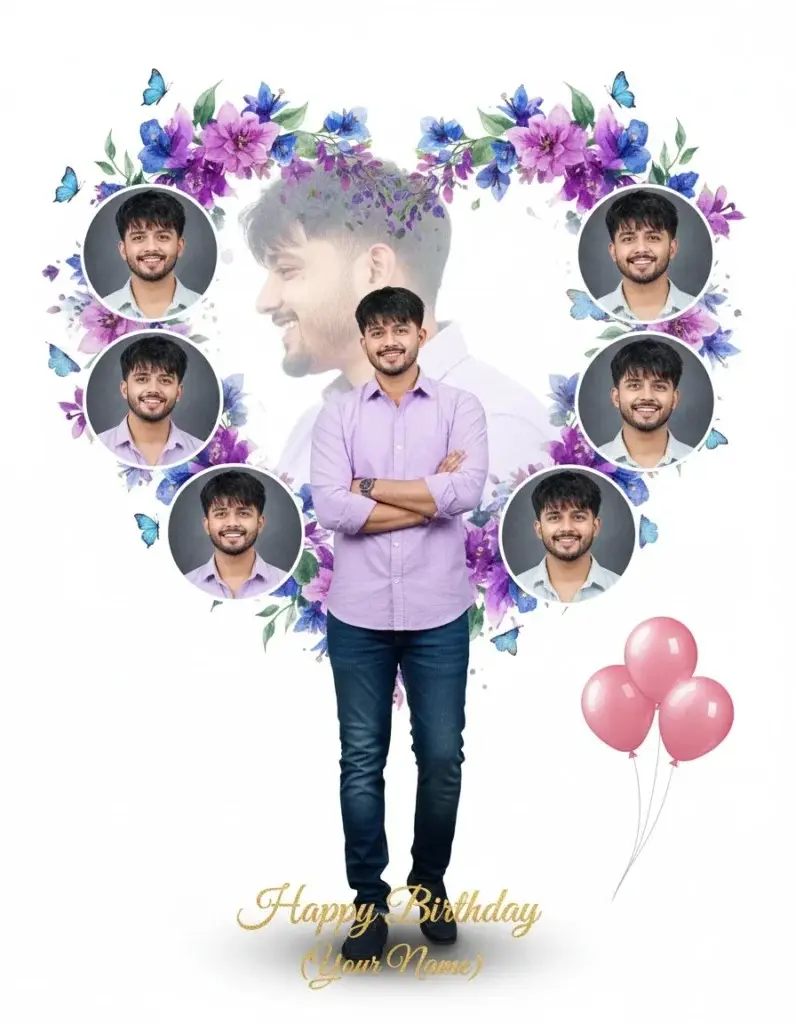 A stylish birthday collage portrait of a handsome young man (use uploaded image as face reference), smiling confidently, wearing a lavender shirt with rolled-up sleeves. Central full-body pose with arms gently crossed. Surrounding hìm in a heart-shaped halo: 5 smaller headshots (same face) at different angles, all smiling. Entire composition framed by lush watercolor-style purple-blue-green florals, leaves, and floating blue butterflies. Behind the central figure: soft double-exposure of his face (eyes closed, serene smile) blended into blooming bougainvillea. Golden sparkling text “Happy Birthday (YOUR NAME)” at bottom center. Three pink balloons float in lower right. Clean white background, soft shadow under figure, smooth DSLR lighting. 8K photorealistic, Hapartistic collage, bright cheerful theme.