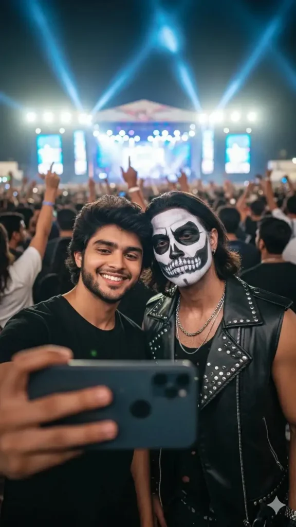 Create a realistic selfie of two men at a live concert with bright stage lights and a crowd in the background.The first person (user) wears a black T-shirt, and his face, hairstyle, and skin tone must exactly match the reference image, no changes.The second person (Talwinder) looks exactly like his reference photo, same skeleton makeup, outfit, and accessories.Both look natural and close together as if taking a selfie.The image should look ultra-realistic, cinematic, and professionally lit, with both faces 100% matching the references.–ar 3:4 –v 6 –style realistic –quality