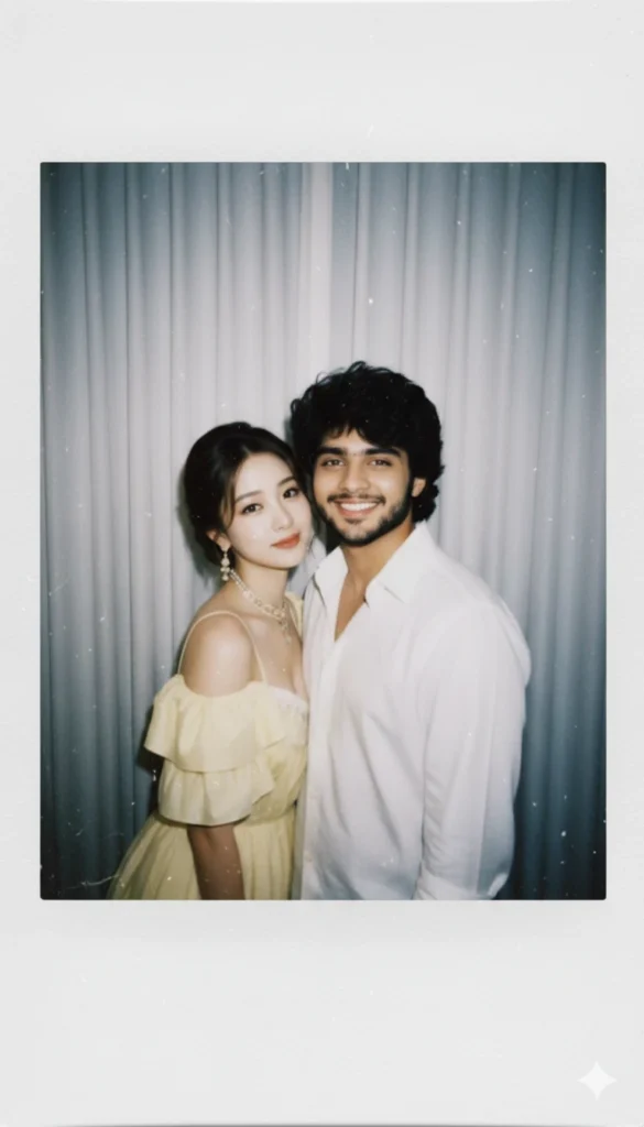 Take a photo taken with a Polaroid camera.The photo should look like an ordinary photograph, without an explicit subject or property. The photo should have a slight blur and a consistent light source, like a flash from a dark room, scattered throughout the photo. Don’t change the face.Change the background behind those two people with white curtains. With that boy and me make a cute poses”