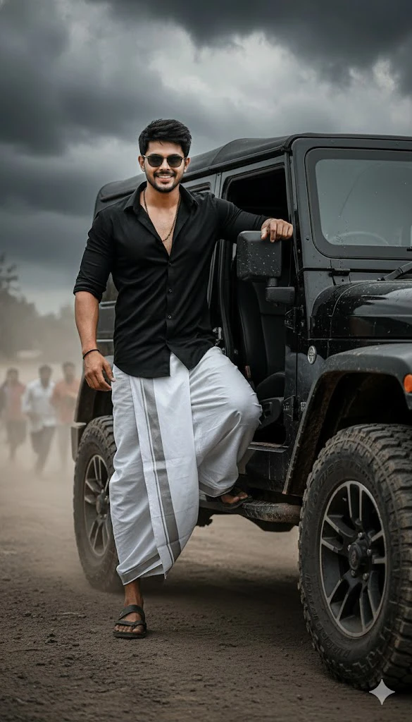 Ultra realistic, high-resolution cinematic poster of a person stepping into a rugged black off-road jeep under a dramatic cloudy sky. He has short styled hair, Face with the face from the uploaded image, keeping the facial features exactly the same. He wears a half-sleeve black shirt with the sleeves rolled up, unbuttoned slightly at the chest, revealing a beaded chain around his neck. His lower attire is a traditional crisp white veshti/dhoti with a shiny silver border, folded up in a rugged style, adding to his bold presence. His arm rests on the jeep as he steps. The jeep is large, black, and detailed with thick tires and metallic parts. Dust rises in the background where faint silhouettes of people are running, adding tension and dynamism. The lighting is dramatic and moody, highlighting his figure with cinematic depth, shadows, and contrast. The entire atmosphere conveys strength, authority, cinematic ultra realistic.