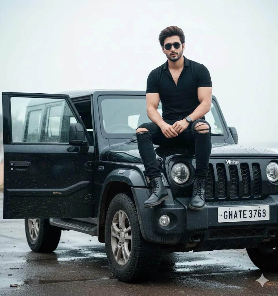 A stylish confident young man half stepping out of a rugged black SUV (Thar) on a wet Mumbai beach street, driver-side door wide open. Medium-length pompadour fade hair, short boxed beard, black round sunglasses. Outfit all black: fitted half-sleeve shirt with open collar, ripped skinny jeans with tears on both knees, black leather combat boots black pple wristwatch. Left hand resting on open car door, right foot overeted body leaning slightly out. SUV slightly dirty, tiros visible. Background: distantsca, greener blurred, overcast bright sky. Mood: cinematic, modern, masculine, cool color tone. ingh clarity and contrast.”